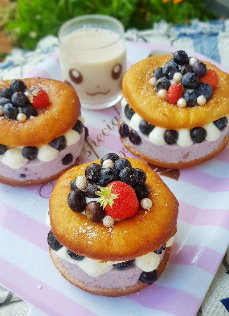 - Die Sahne mit 50 g Zucker mischen und kurz anrühren. Sahnesteif hinzugeben und die Sahne steif schlagen. Schlagsahne in einen Spritzbeutel füllen. Die festgewordene Blaubeercreme mit dem gleichen Ausstecher, den ihr für die Donuts verwendet habt (Rezept in Manga Kochbuch Kawaii) ausstechen. Wer keinen Dessertring dafür hat kann auch eine gleichgroße Tasse oder Glas nehmen. Die Donuts aufschneiden. Blaubeercremefüllung auf den unteren Teil des Donuts legen. Darauf am Rand abwechselnd Sahne und Blaubeeren auflegen. Die Mitte des Donuts mit Sahne ausfüllen und den Deckel aufsetzen.