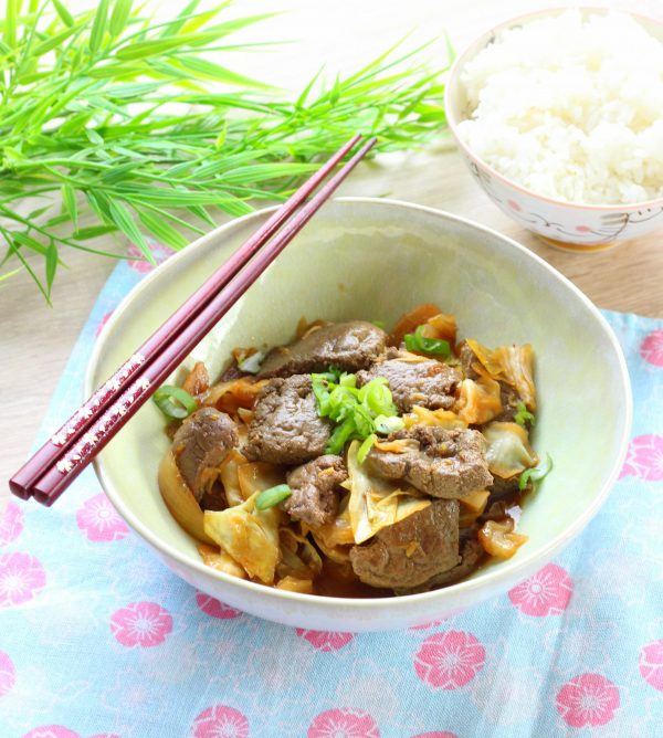 Den Spitzkohl waschen und in kleine Quadrate schneiden. Die Zwiebel schälen und in Streifen schneiden. Die Frühlingszwiebel waschen und in dünne Ringe schneiden. Die Leber kurz abspülen und in mundgerechte Stücke schneiden. Die Leberstücke in eine Schüssel geben, vorischtig mit Wasser bedecken und 10 Minuten stehen lassen. In dieser Zeit Sojasoße, Honig, Sake, Mirin, Su, Austernsoße und geriebenen Ingwer in einer kleinen Schüssel mischen. Dann das Wasser von der Leber vorsichtig abgießen. Den Soßenmix zur Leber geben und 15 Minuten ziehen lassen.